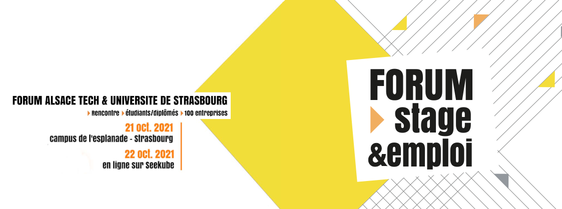 Co-organisé par l'Université de Strasbourg et les quatorze grandes écoles d’ingénieurs, d’architecture et de management d’Alsace du réseau AlsaceTech, le Forum stage-emploi est, depuis 2018, la plus grande rencontre étudiants - diplômés - entreprises du Grand Est. Pour cette édition 2021, près de 84 entreprises seront présentes à la Halle des sports (campus de l'Esplanade - Strasbourg) le 21 octobre et près de 120 entreprises seront représentées au job-dating en ligne le 22 octobre.