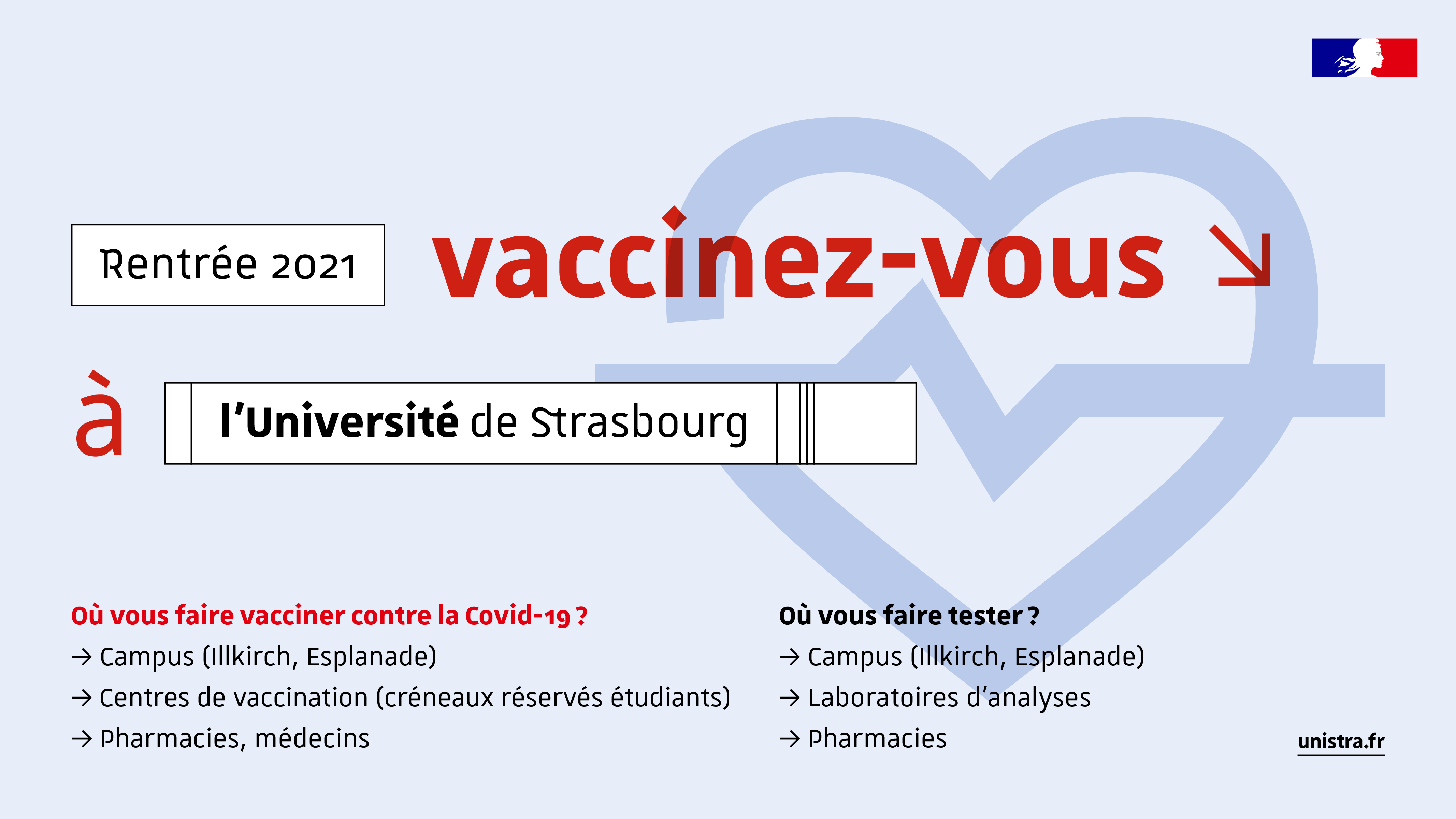L’Université avec l’Agence régionale de santé Grand-Est encourage les étudiants à se faire vacciner afin d’accélérer le processus d’immunité collective et ainsi retrouver une vie étudiante plus sereine sur les campus. Durant toute la période de rentrée, plusieurs dispositifs sont mis à disposition des étudiants pour réaliser des tests, les sensibiliser et se faire vacciner.
