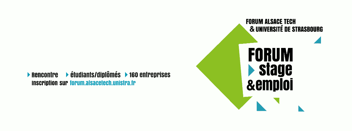 Co-organisé par l'Université de Strasbourg et les quatorze grandes écoles d’ingénieurs, d’architecture et de management du réseau AlsaceTech, le Forum stage-emploi 2023 se déroule jeudi 19 octobre 2023 en présentiel & du 20 au 27 octobre 2023 en ligne. Plus de 160 entreprises de différents secteurs d’activités seront présentes pour proposer 800 offres de stages et d'emplois. Un événement incontournable pour tous les étudiants et jeunes diplômés de Bac+2 à Bac+8 !