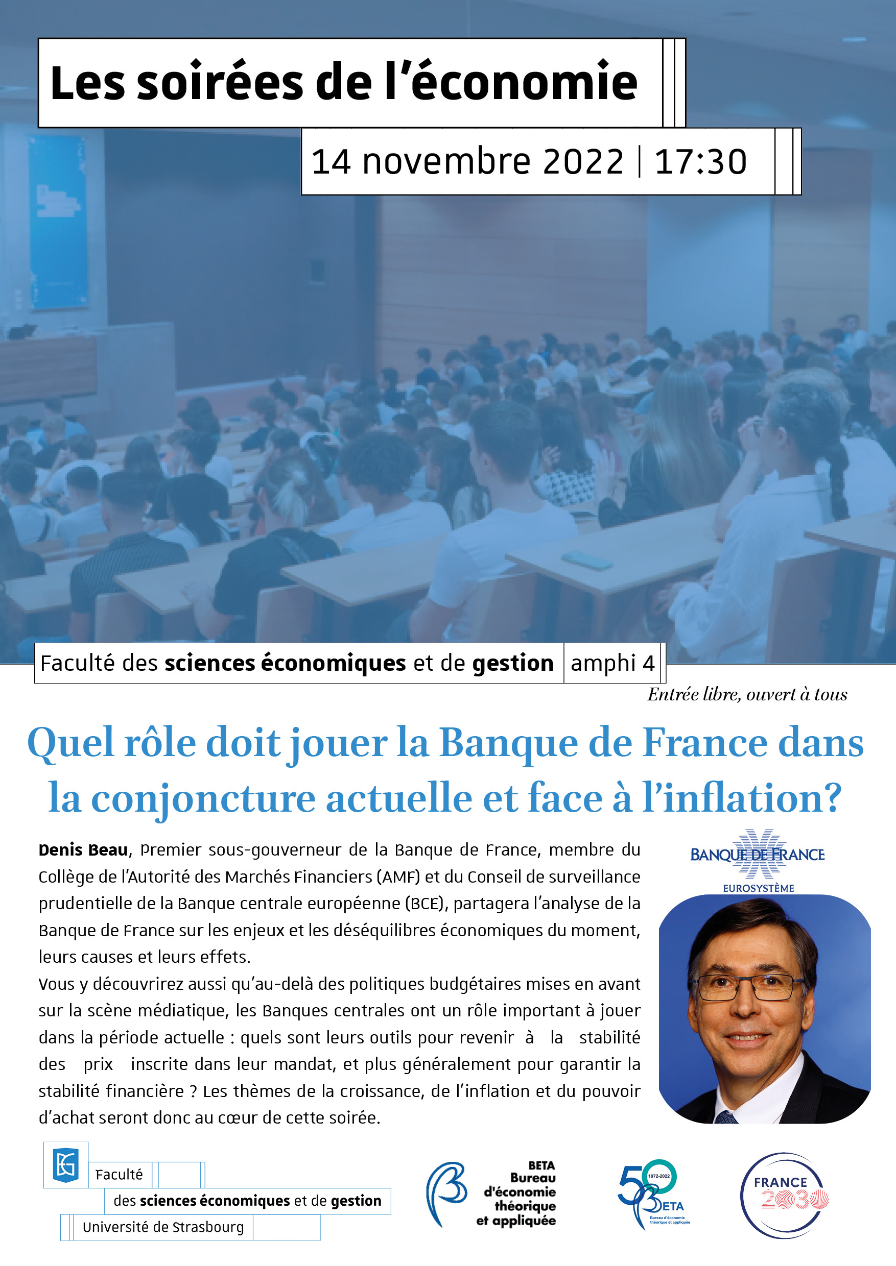 Le prochain rendez-vous des soirées de l'économie intitulé « Quel rôle doit jouer le Banque de France dans la conjoncture actuelle et face à l’inflation ? » aura lieu lundi 14 novembre 2022, 18h00 à la de la Faculté des sciences économiques et de gestion.