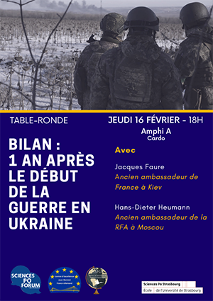 Le Centre d'Excellence Jean Monnet, en collaboration avec les associations Sciences Po Forum et M.I.R.A (Master of International Relations Association) vous donne rendez-vous pour une table ronde « Bilan : 1 an après le début de la guerre en Ukraine », jeudi 16 février à 18h au Cardo sur le site de l'ancien hôpital civil. Elle sera animée Jacques Faure, Ancien ambassadeur de France à Kiev et Hans-Dieter Heumann, Ancien ambassadeur de la RFA à Moscou.
