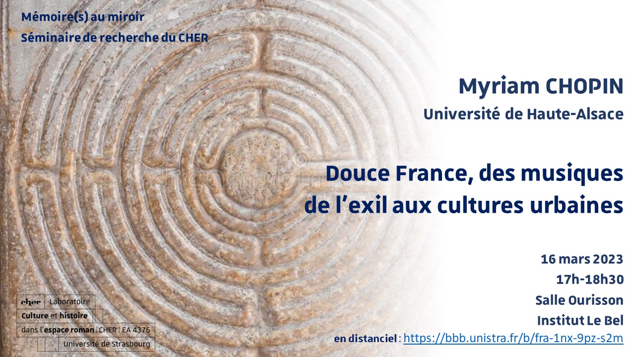 Le troisième séminaire du CHER "Mémoire(s) en miroir"aura lieu le jeudi 16 mars 2023 à 17h00 en salle Ourisson à l'Institut Le Bel. Myriam Chopin (Université de Haute Alsace) évoquera : « Douce France, des musiques de l'exil aux cultures urbaines »