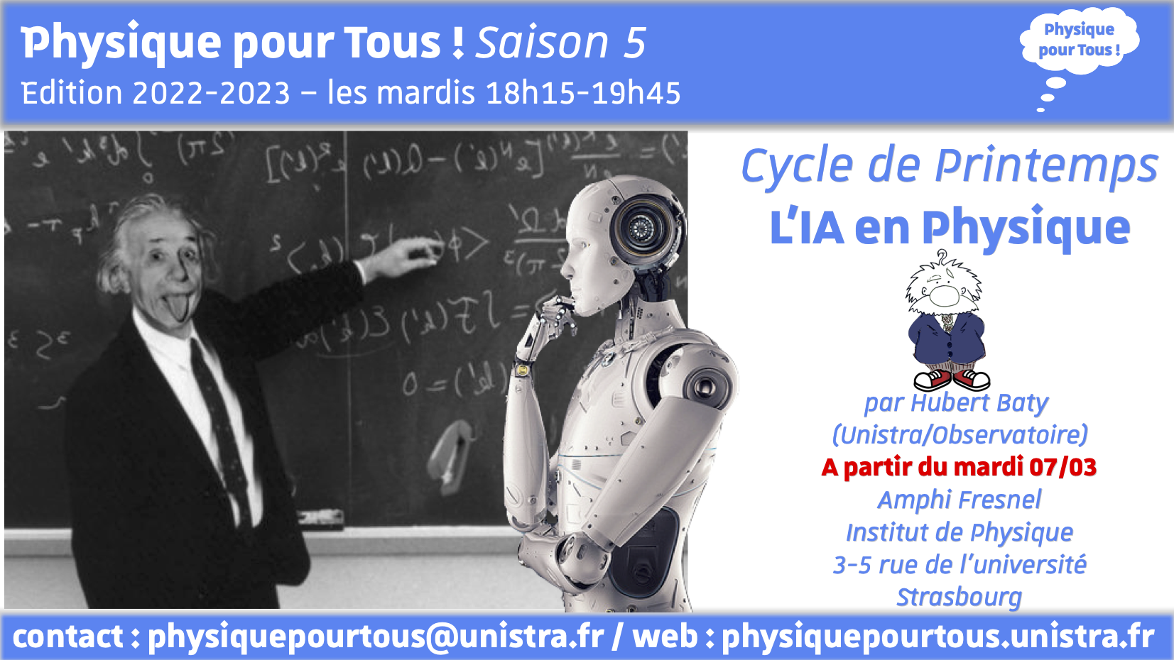 Cycle de Printemps « L’Intelligence Artificielle en Physique", proposé par Hubert Baty (Université de Strasbourg & Observatoire Astronomique de Strasbourg) à partir du mardi 07 Mars 2023 pour 3 cours (1 cours par semaine).
