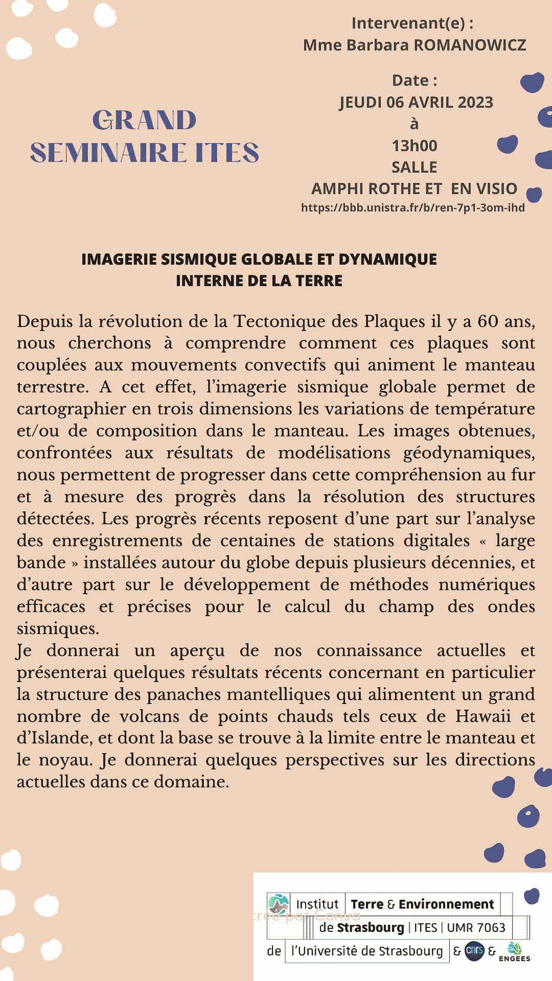 Un séminaire de l'Institut Terre et Environnement de Strasbourg (ITES) intitulé « Imagerie sismique globale et dynamique interne de la terre » aura lieu jeudi 6 avril à 13h à l'Ecole et observatoire des sciences de la terre (EOST), sur le campus de l'Esplanade. Il sera animé par Mme Romanowicz Barbara, Professor of the Graduate School, Department of Earth and Planetary Science, University of California, Berkeley Professeur honoraire, Collège de France, Paris.