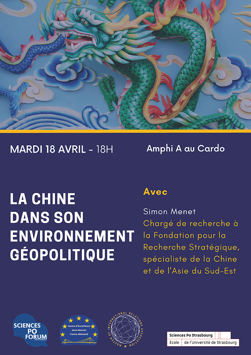 Le centre d’Excellence Jean Monnet piloté par Sciences Po Strasbourg organise une conférence sur la Chine de 18h à 20h mardi 18 avril 2023 à Sciences Po Strasbourg, 7 rue de l’écarlate dans l’amphithéâtre A.