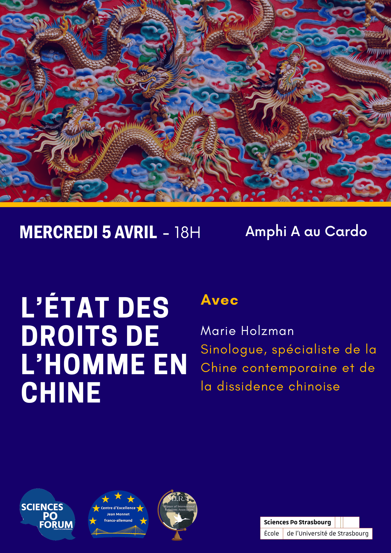 À cette occasion Marie Holzman sinologue, spécialiste de la Chine contemporaine et de la dissidence chinoise sera présente. De 18h à 20h accompagnée de Sylvain Schirmann elle abordera l'état des droits de l'homme en Chine. À l'issue de cette conférence les élèves seront invités à échanger avec Mme Holzman. Nous espérons que cet événement vous plaira et que vous viendrez nombreux.
