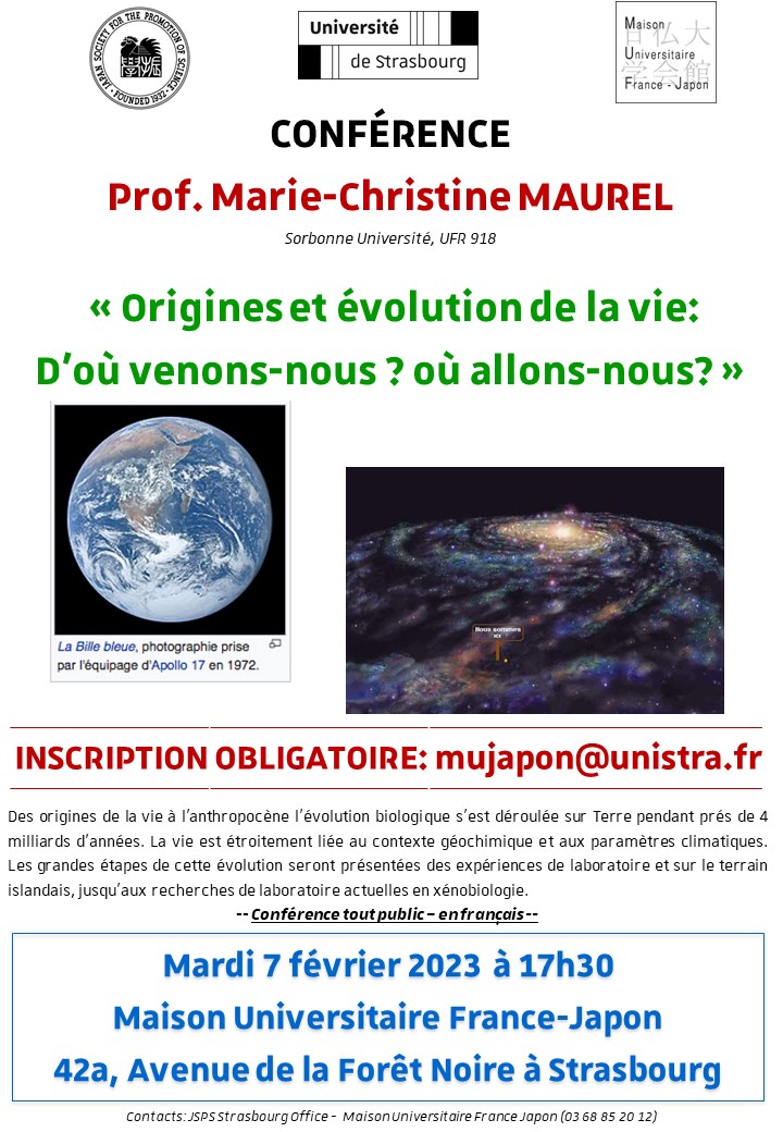 Une journée d'études intitulée « Origines et évolution de la vie : D’où venons-nous ? Où allons-nous ? » mardi 11 avril à 17h30 à la Maison Universitaire France-Japon. Elle sera animée par le Prof. Marie-Christine Maurel, Sorbonne Université, UFR918.