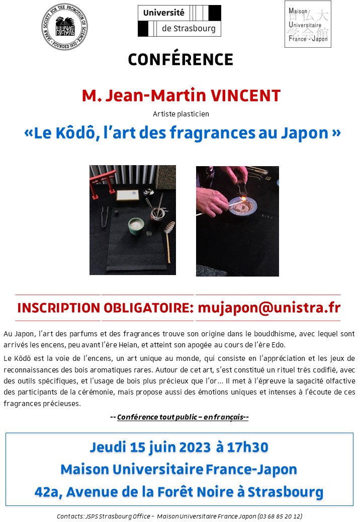 Une conférence intitulée « Le Kôdô, l'art des fragrances au Japon » aura lieu jeudi 15 juin à 17h30 à la Maison France-Japon. Elle sera animé par M. Jean-Martin Vincent, artiste plasticien.