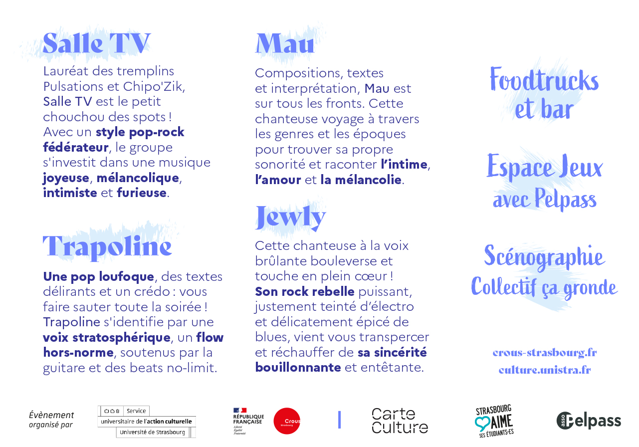 Événement proposé par le Suac et le Crous de Strasbourg, en partenariat avec Strasbourg Aime ses Étudiants, l'association Pelpass et avec le soutien du dispositif Carte Culture.