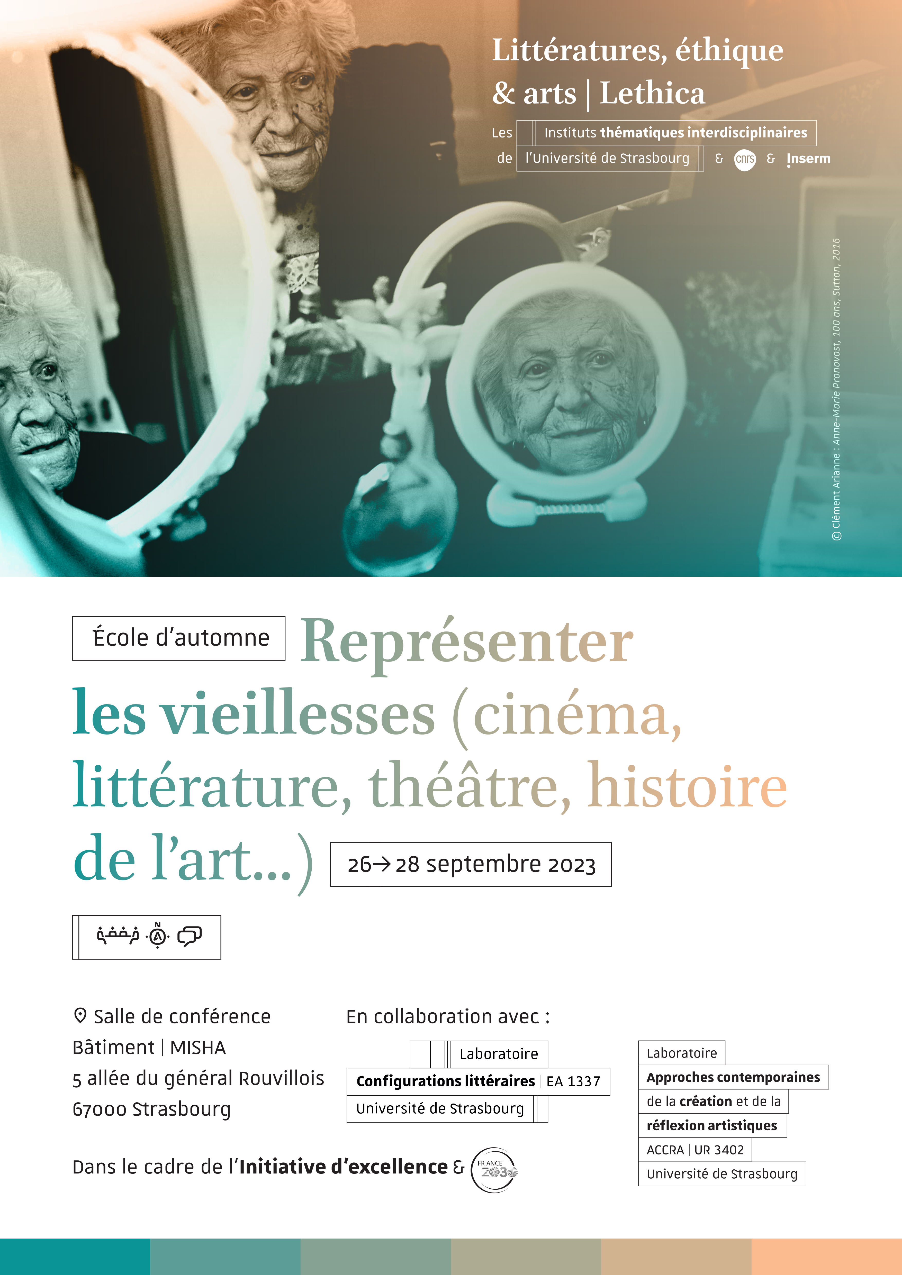 Après les éditions de 2021 et de 2022, la prochaine école d'automne de l'ITI Lethica, aura lieu du 26 au 28 septembre 2023 à la Maison interuniversitaire des sciences de l'Homme - Alsace (MISHA). Cet événement sera l'occasion d'interroger les représentations des vieillesses à travers différents arts, en lien avec les quatre axes de recherche de Lethica :
