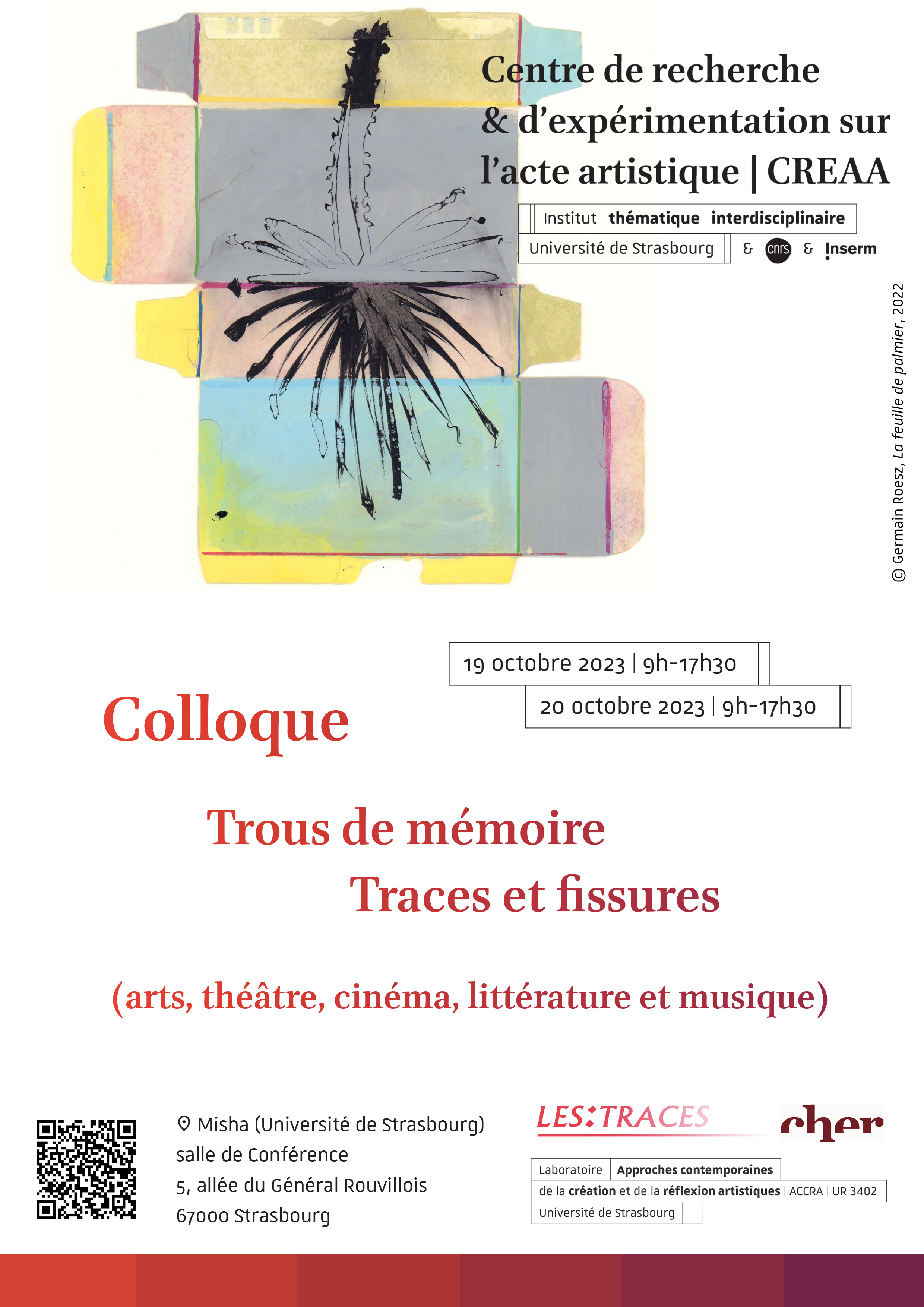 Ce colloque proposera d’examiner la manière dont les arts (théâtre, cinéma, littérature, peinture, sculpture et musique) (re)dessinent, (re)tracent et (re)déploient les toiles et les partitions mémorielles individuelles, familiales et collectives à partir des traces, des fissures, des failles, des interstices, des lapsus, des oublis, des pertes de mémoires, des retours du refoulé, de « la mémoire de ce qu’on oublie », des zones d’ombre, des cryptes, des images et des paroles confisquées, de « la mémoire empêchée », « manipulée » ou « obligée », de « la mémoire blessée » (Ricœur), des « processus oublieux », des silences, des dénis, des angles morts, des fragments épars, des strates superposées et/ou hybridées, du pouvoir de la mémoire et du pouvoir sur la mémoire. Ce qui nous conduira aussi à réinterroger, dans une mise en regard, les formes de l’engagement et la culture et les formes de la commémoration – « la mémoire orthopédique, figée dans les commémorations stériles », la mémoire « vitrine ». Engagement et commémoration, sont deux mots clés du programme de recherche de LES:TRACES « Laboratoire des Études Sur : Trauma, Commémoration, Engagement, Sons ».