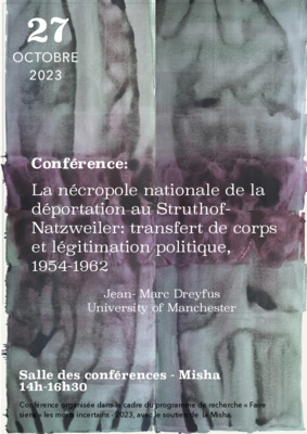 Dans cette conférence intitulée « La nécropole nationale de la déportation au Struthof-Natzweiler : transfert de corps et légitimation politique 1954-1962 », Jean-Marc Dreyfus reviendra sur l'histoire de la création de la nécropole du camp de concentration nazi de Natzweiler-Struthof, où sont inhumés les corps de plus de mille individus, venus de toute l'Allemagne. Cette conférence s'inscrit dans le cadre du programme de recherche "Faire siens les morts incertains", soutenu par la Misha pour l'année 2023, qui s’intéresse à la prise en charge de restes humains « incertains » produits par les violences de masse dans des contextes socioculturels variés.
