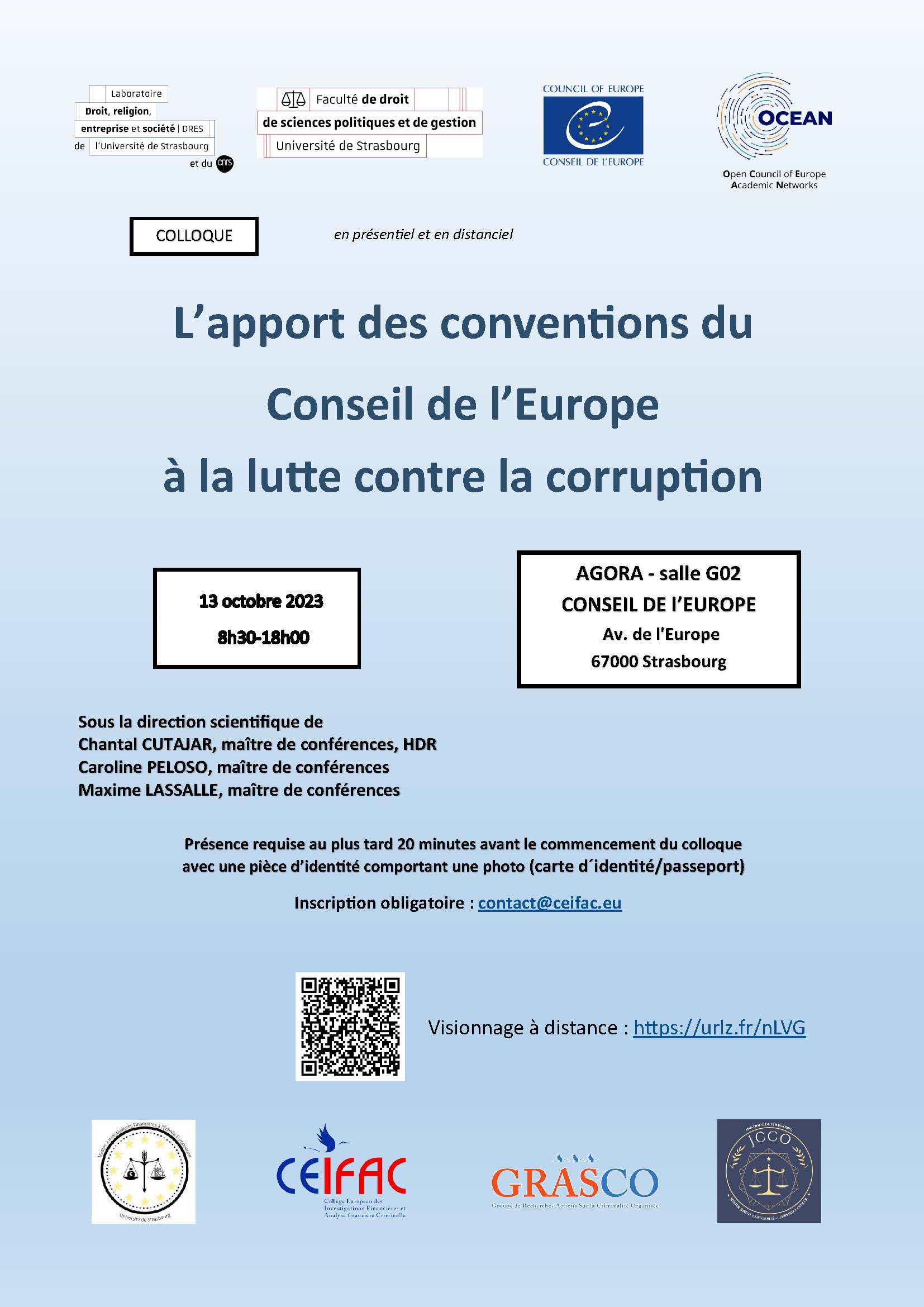 Un colloque intitulé « L’apport du Conseil de l’Europe à la lutte contre la corruption » aura lieu vendredi 13 octobre à 8h30 au Conseil de l'Europe.