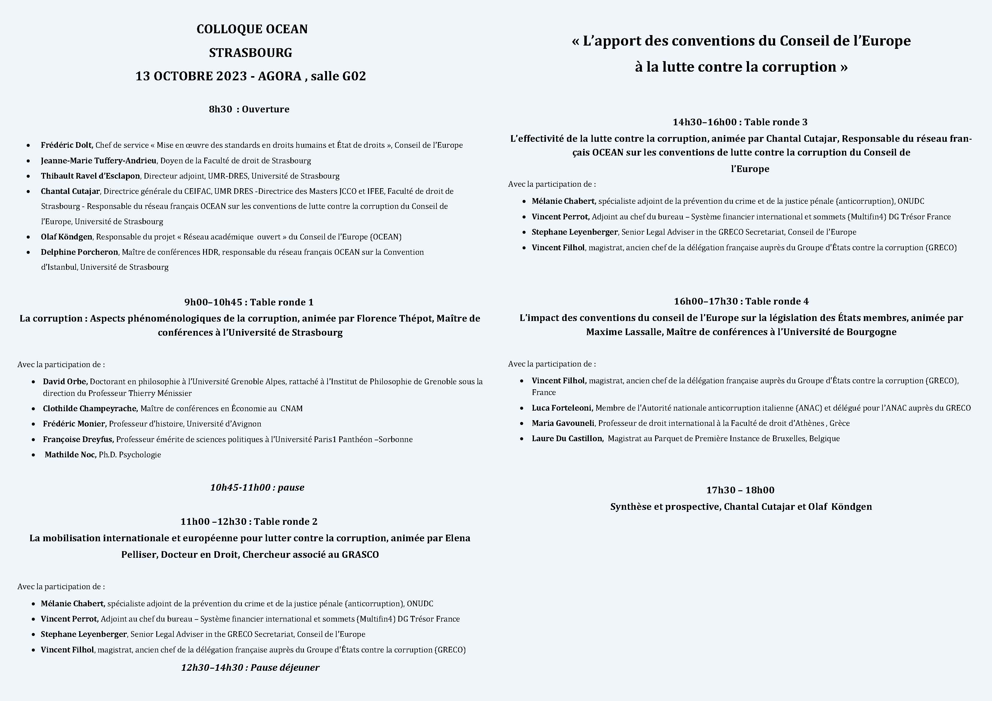 La corruption est un phénomène complexe. Pour apporter des réponses juridiques efficaces, il est indispensable d’en avoir une compréhension la plus fine possible. Cela nécessite de convoquer plusieurs disciplines : philosophie, histoire, économie, sciences politiques, psychologie (Table ronde 1). La lutte contre la corruption est devenue un impératif catégorique pour la sauvegarde des États de droit. Cela explique que plusieurs organisations internationales et européennes aient élaboré des instruments juridiques visant à prévenir et à sanctionner la corruption : les Nations-Unies, l’OCDE, le Conseil de l’Europe et l’Union européenne. (Table Ronde 2). Ces organisations mettent en œuvre des outils permettant de contrôler le respect de ces conventions par les États et de formuler des recommandations (Table Ronde 3). Le colloque mettra l’accent sur l’impact des conventions du Conseil de l’Europe sur la législation des États avec un focus sur la France, l’Italie, la Belgique et la Grèce (Table ronde 4).