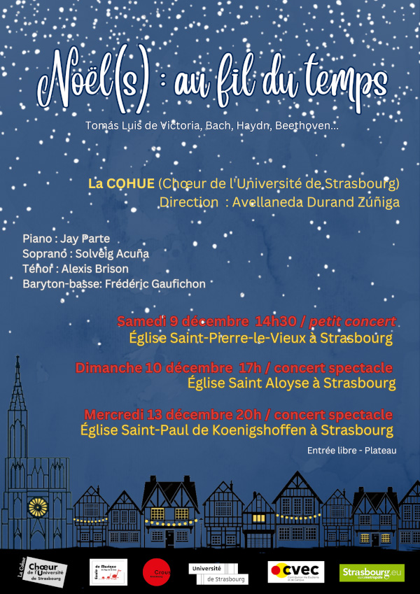 Un petit concert donné par « La Cohue », choeur de l'université de Strasbourg sur le thème de « Noël(s) : au fil du temps » aura lieu samedi 9 décembre à 14h30 à l'Église St-Pierre-le-Vieux .