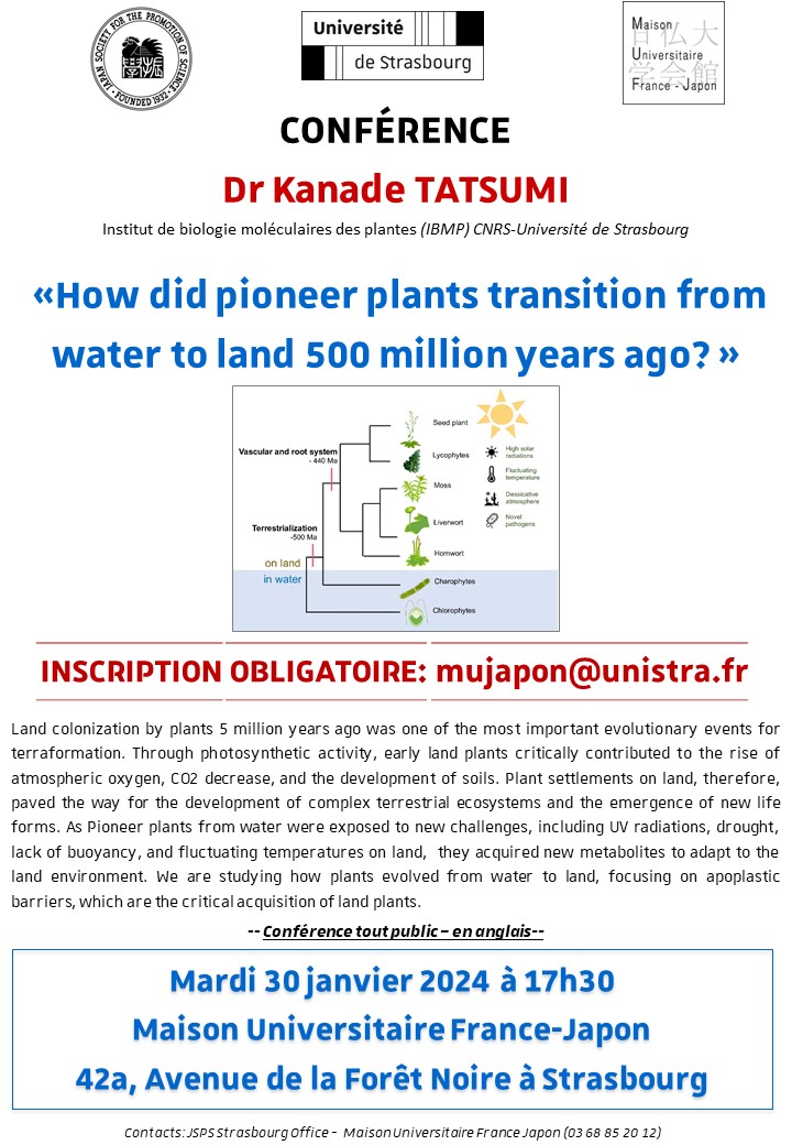 Une conférence intitulée « How did pioneer plants transition from water to land 500 million years ago ? » aura lieu mardi 30 janvier à 17h30 à la Maison France Japon.