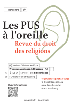 Premier rendez-vous, jeudi 18 janvier, entre 12h30 et 13h30, à la bibliothèque de l’Alinéa, pour une rencontre avec Françoise Curtit et Gérard Gonzalez, les directeurs de la Revue du droit des religions (également disponible gratuitement et en intégralité sur OpenEdition !)