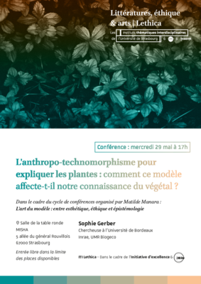 Une conférence intitulée « L'anthropo-technomorphisme pour expliquer les plantes : comment ce modèle affecte-t-il notre connaissance du végétal ? » aura lieu mercredi 29 mai à 17h à la Maison interuniversitaire des sciences de l'homme - Alsace (Misha).