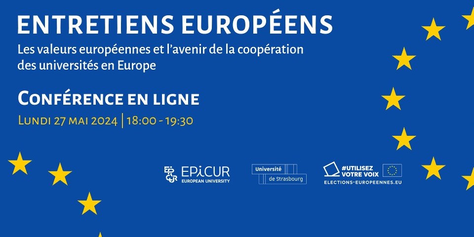 Dans le cadre des élections européennes, l'Université de Strasbourg a le plaisir de vous inviter à une web-conférence intitulée « L'avenir de la coopération des universités en Eruope » lundi 27 mai à 18h. Pour débattre avec des chercheurs sur les valeurs européennes.