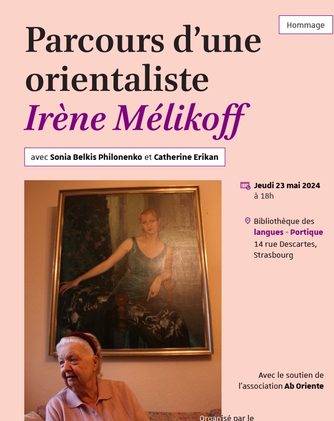 Un hommage à Irène Mélikoff (avec Sonia Belkis Philinenko et Catherine Erikan) aura lieu jeudi 23 mai à 18h à la bibliothèque de langue du Portique sur le campus de l'Esplanande.