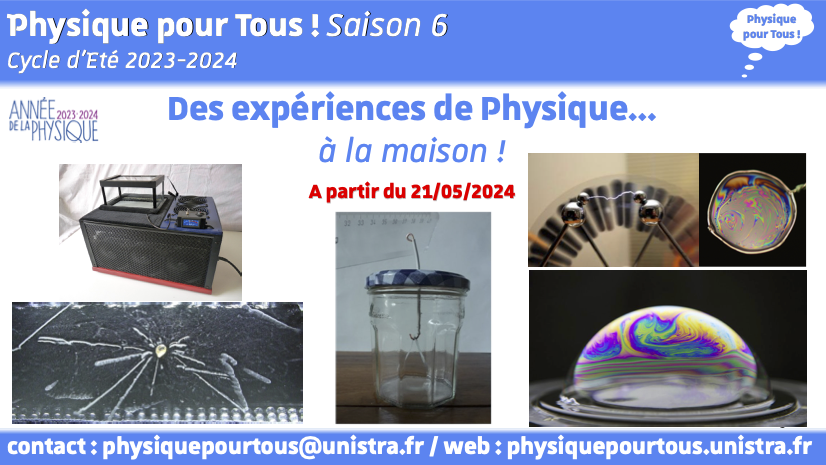 Cycle d'Eté « Des expériences de Physique à réaliser chez soi », proposé par un collectif IPHC/ICS (Pierre Van Hove, Thierry Pradier, Thierry Charitat, Pierre Müller) à partir du mardi 21 mai 2024 pour 4 cours (1 cours par semaine)