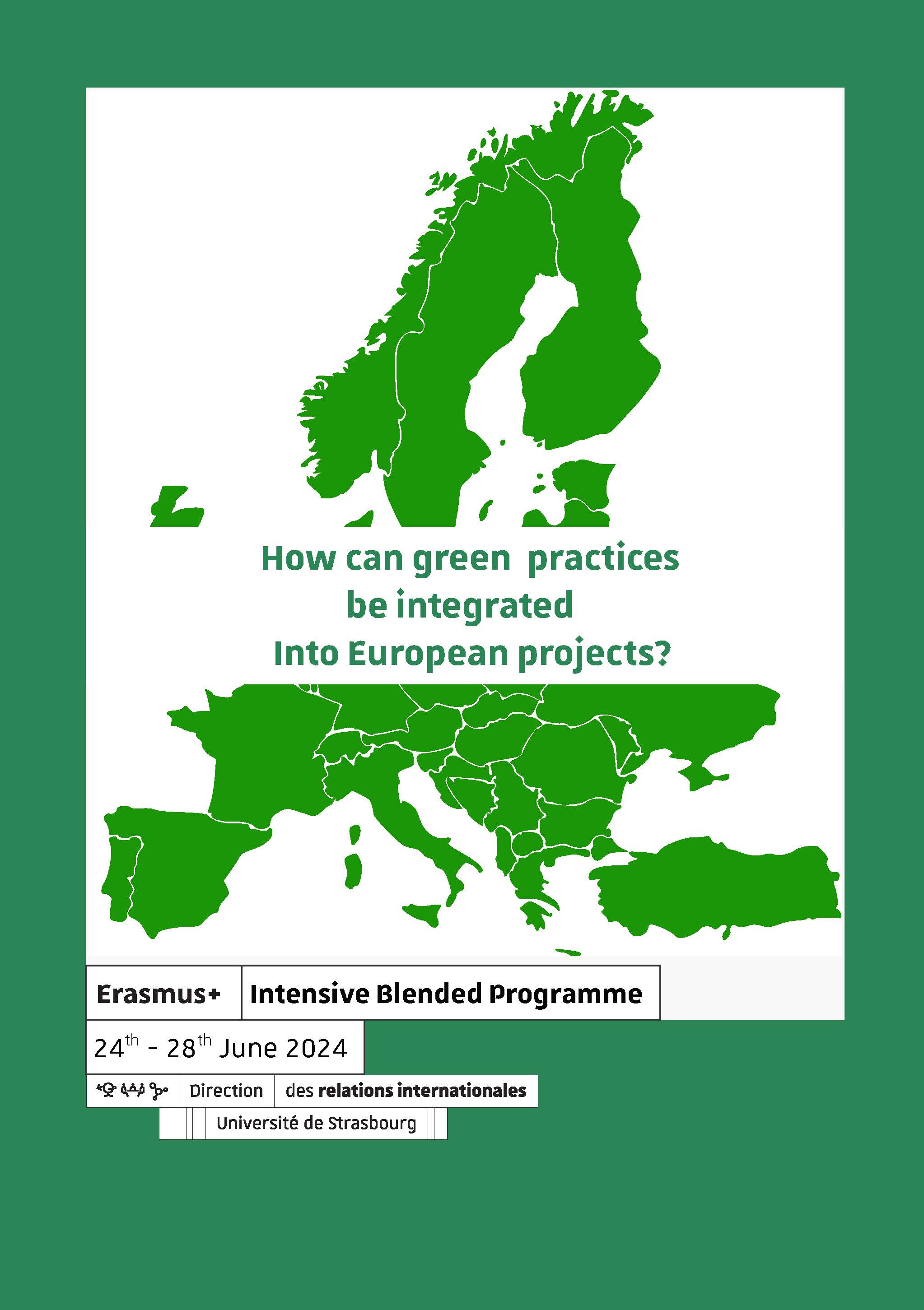 La Direction des relations internationales a le plaisir de vous inviter à la staff week « How can green practices be integrated into European Projects ? » organisée du lundi 24 au vendredi 28 juin 2024.