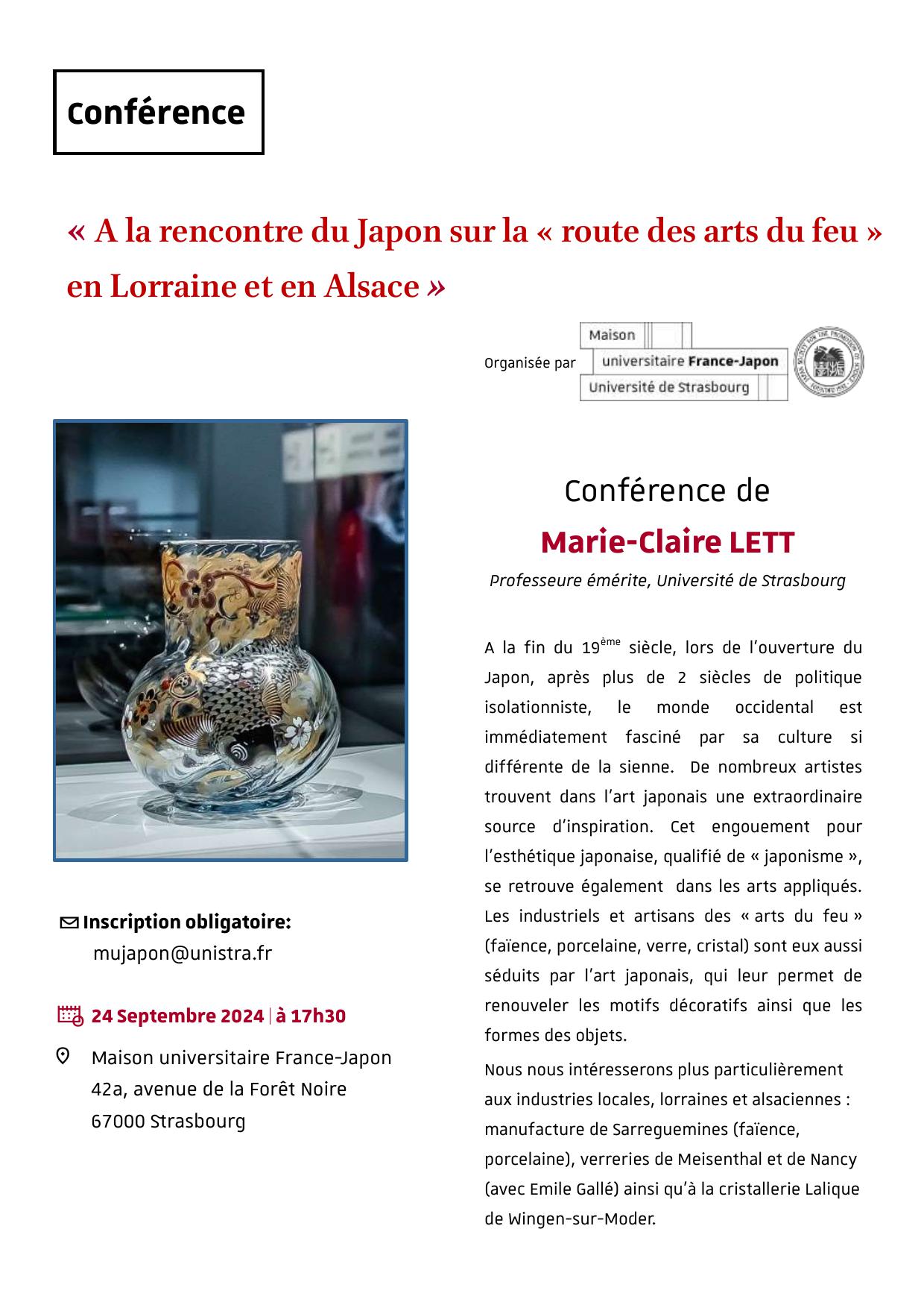 Une conférence intitulée « À la rencontre du Japon sur la « route des arts du feu » en Lorraine et en Alsace » mardi 24 septembre à 17h30 à la Maison France-Jarpon. Elle sera donné par le Prof. Marie-Claire LETT, professeure émérite de l'Université de Strasbourg.