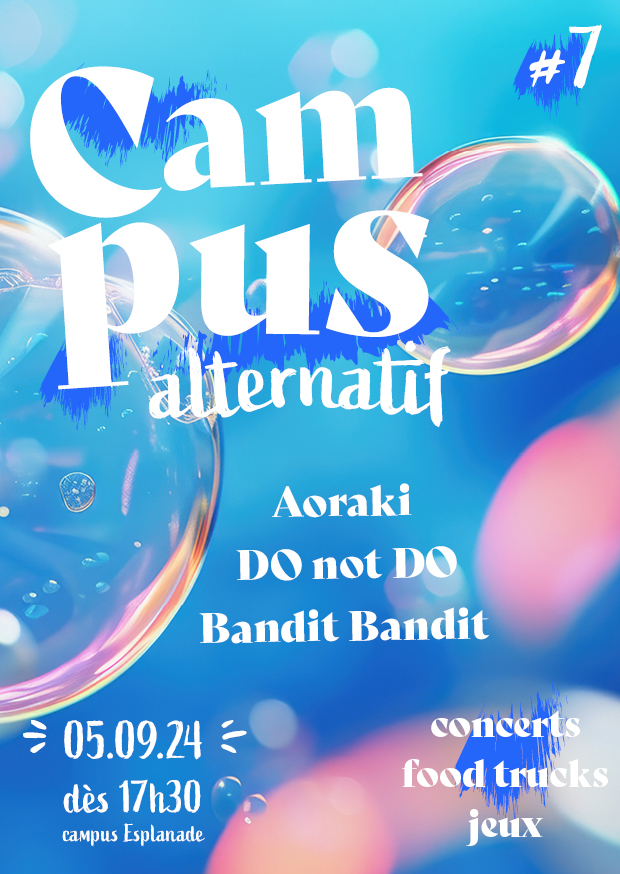 Venez prolonger l'été en musique entre ami·es, collègues ou en famille aux côtés de trois groupes éclectiques qui feront groover le Campus central ! Au programme de cette 7e édition de Campus Alternatif : Bandit Bandit (rock), Do not Do (pop électro) ainsi que le lauréat étudiant du tremplin musical Pulsations, Aoraki (indie pop). Dans cette ambiance festivalière, food trucks, buvette et jeux seront aussi de la partie !