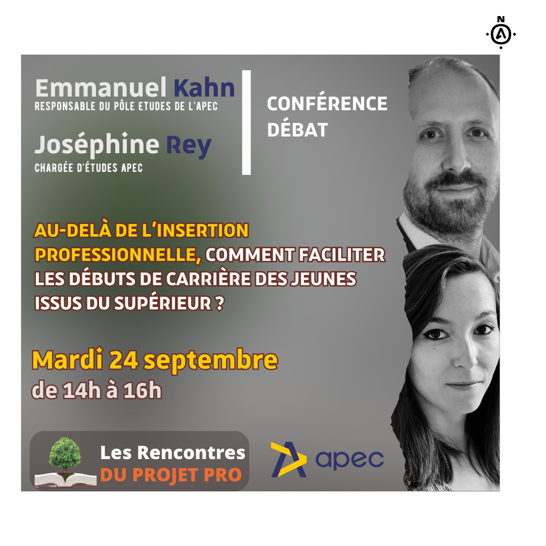 Cette conférence-débat propose de questionner les besoins spécifiques des jeunes cadres lors de leur insertion et premiers pas en entreprise. En s’appuyant sur 3 études menées par l’Observatoire de l’Apec, elle interrogera le rapport au travail des jeunes ainsi que leurs craintes et difficultés en début de carrière. Elle visera à mettre en lumière ces enjeux et à engager le débat sur diverses pistes d’action pour mieux accompagner les jeunes cadres dans leurs premières années professionnelles. Cette conférence sera co-animée par Emmanuel Kahn (Responsable du pôle Etudes de l’Apec) et Joséphine Rey (Chargée d’études Apec)