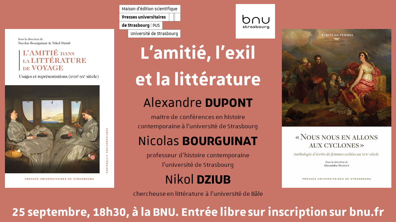 À l’occasion d’une double parution aux Presses universitaires de Strasbourg (PUS), Alexandre Dupont, historien à l'université de Strasbourg, directeur d’un ouvrage sur les femmes et l’exil au XIXe siècle (Louise Michel, Jenny Marx…) dialogue avec son confrère Nicolas Bourguinat et la chercheuse en littérature Nikol Dziub, directeurs d’un recueil sur l’amitié dans la littérature de voyage du XVIIIe au XXe siècle (Gustave Flaubert, Herman Hesse, André Gide…).