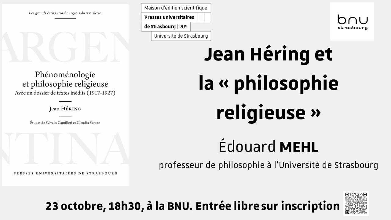 Une Conférence intitulée « Jean Héring et la "philosophie religieuse" » aura lieu mercredi 23 octobre à 18h30 à la bibliothèque nationale universitaire de Strasbourg.
