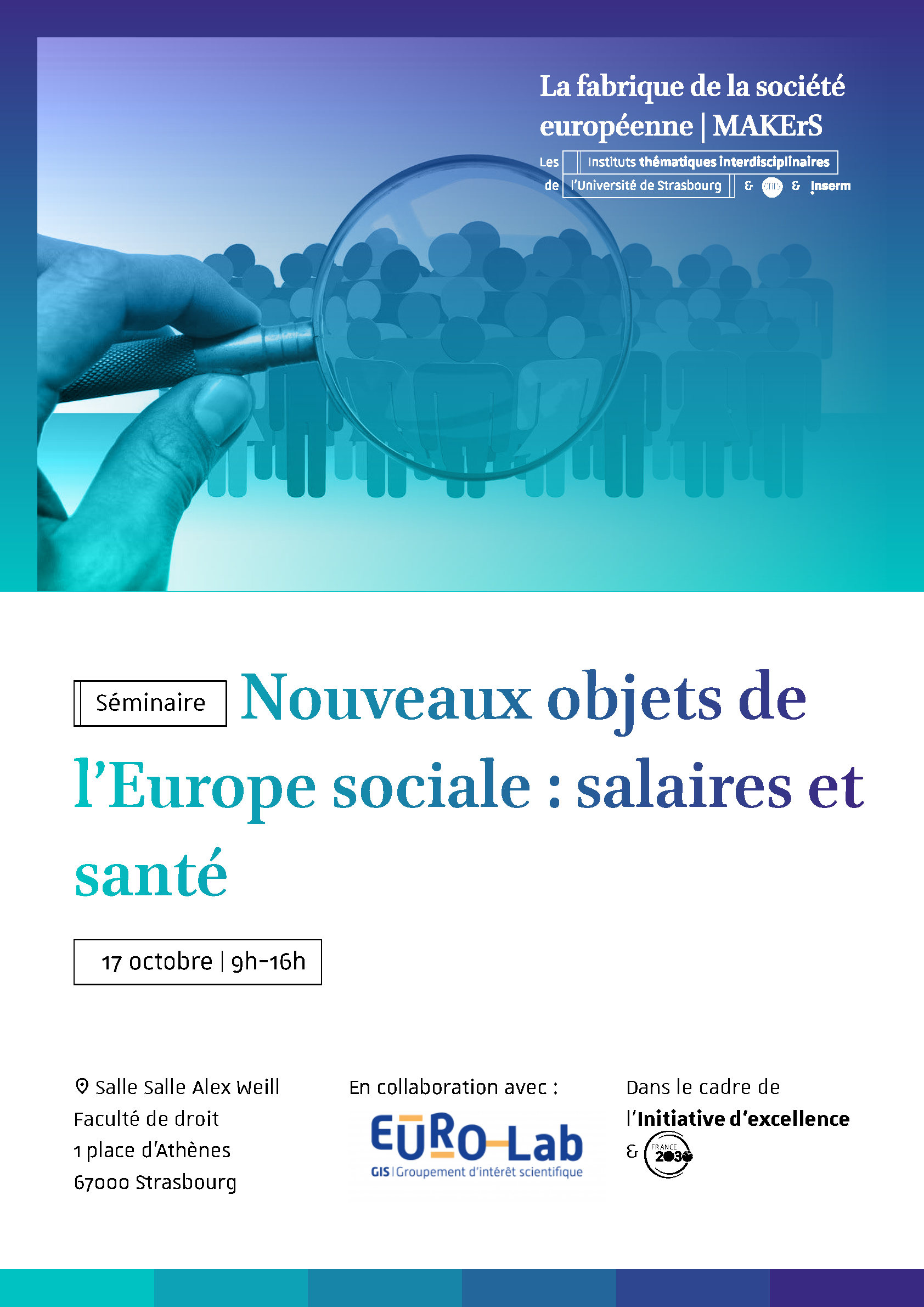 L'ITI MAKErS et le GIS EURO-Lab ont le plaisir de vous inviter à la journée d'études interdisciplinaires dédiée aux « Nouveaux objets de l'Europe sociale : salaires et santé » qui aura lieu jeudi 17 octobre 2024 à partir de 9h30 dans la salle Alex Weill de la faculté de droit de l'université de Strasbourg.