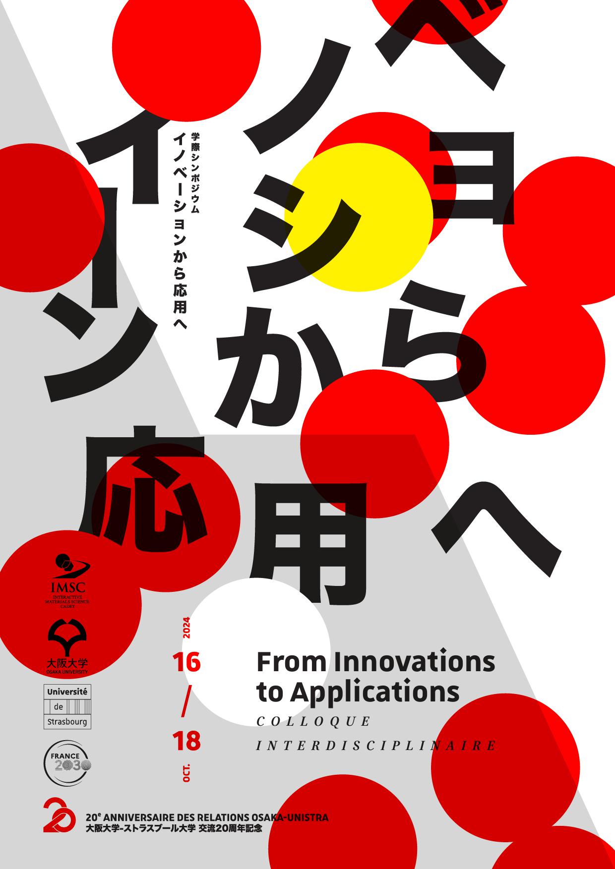 Le colloque « From Innovations to Applications » est organisé pour célébrer le 20e anniversaire et renforcer les échanges et les collaborations entre les universités d’Osaka et de Strasbourg. Il se concentrera sur les relations entre innovation et technologies de pointe, et les modalités de passage à l’application industrielle. L’objectif de ce colloque est d’organiser une rencontre pluridisciplinaire en réunissant des chercheurs de différentes thématiques.