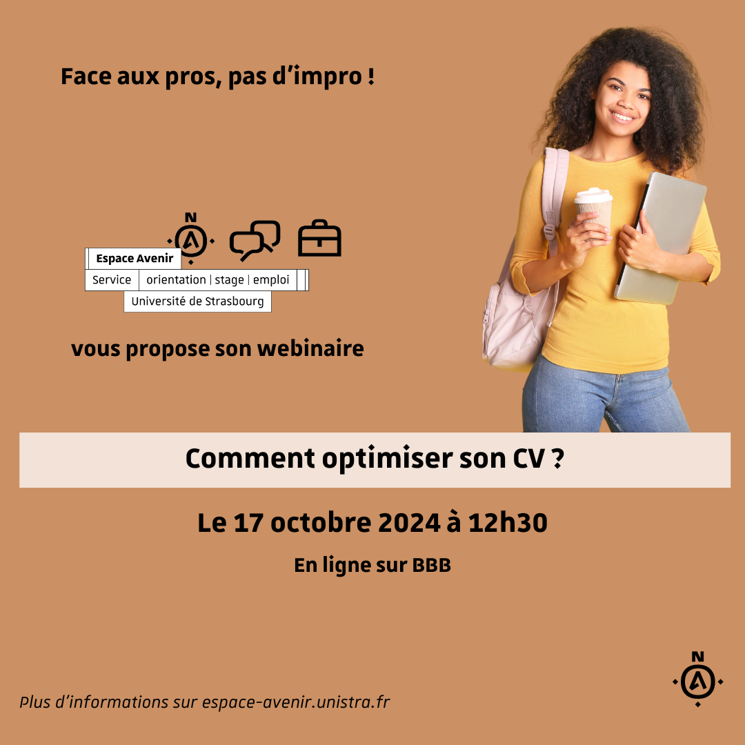 Un webinaire intitulé « Comment optimiser son CV : conseils et astuces » aura lieu jeudi 17 octobre à 12h30.