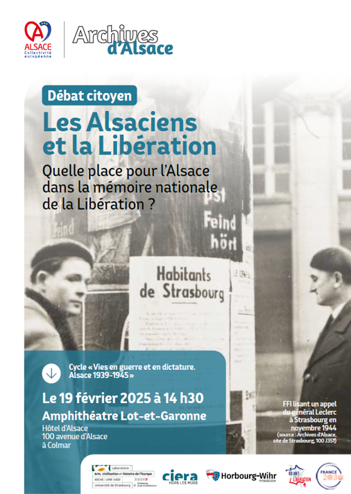 Une conférence suivie d'un débat intitulée « Quelle place pour l'Alsace dans la mémoire nationale de la Libération ? » aura lieu mercredi 19 février 2025 à 14h30 dans l'amphithéâtre Lot-et-Garonne de l'Hôtel d'Alsace à Colmar.