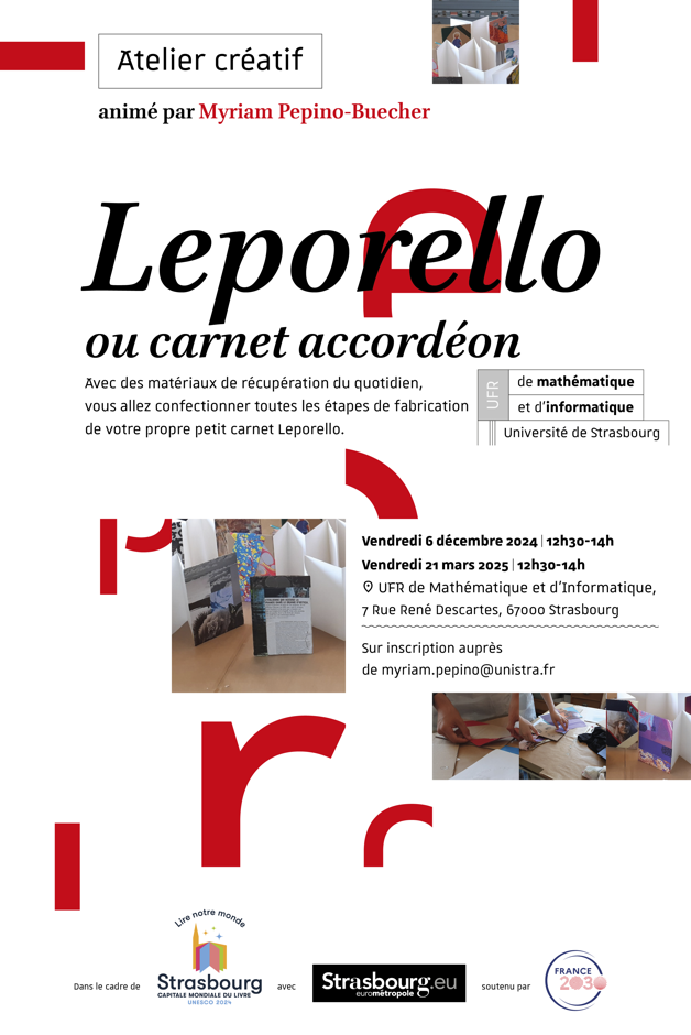 Un atelier créatif intitulé « Carnet accordéon ou Leporello » aura lieu vendredi 21 mars à 12h30 à l'UFR de mathématique et d'informatique sur le campus de l'Esplanade.