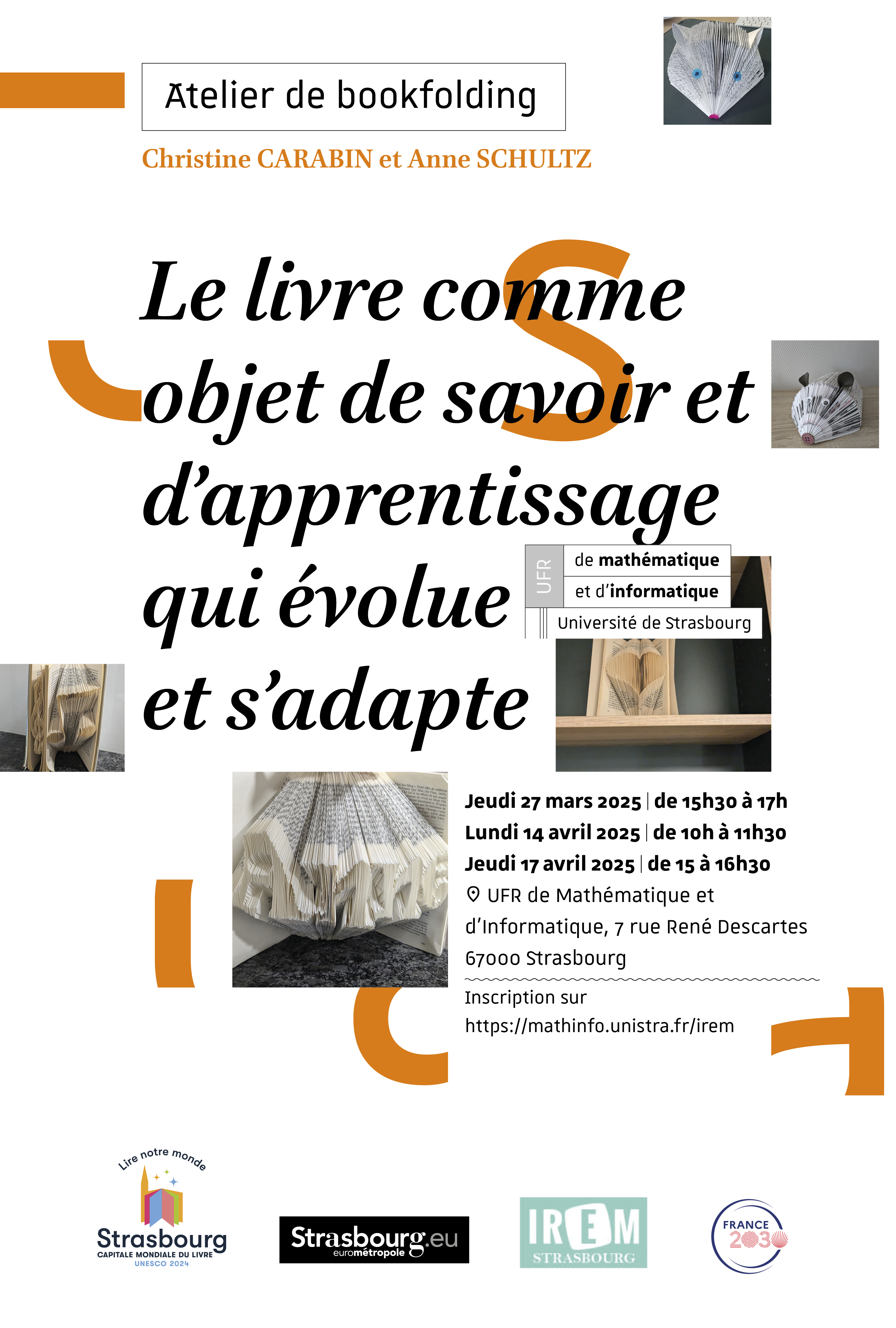 Un atelier « Le Livre comme objet de savoir et d’apprentissage qui évolue et s’adapte » aura lieu jeudi 27 mars à 15h30 à UFR de Mathématique et d'informatique sur le campus de l'Esplanade.