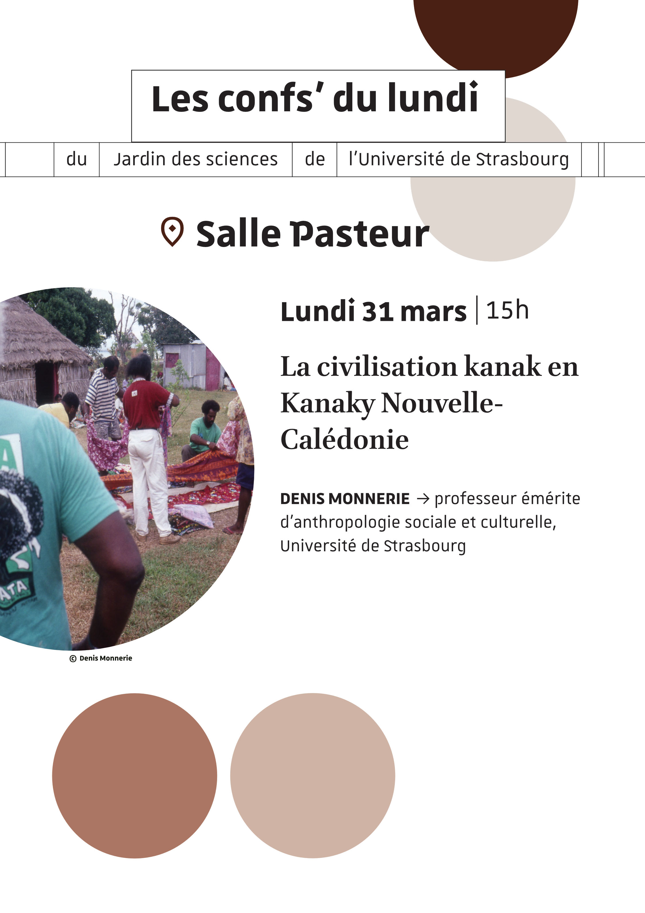 Dans le cadre des Conf' du lundi, une conférence intitulée « La civilisation kanak en Kanaky Nouvelle-Calédonie » aura lieu lundi 31 mars à 15h au Palais universitaire. Elle sera donnée par Denis Monnerie, professeur émérite d'anthropologie sociale et culturelle, Université de Strasbourg