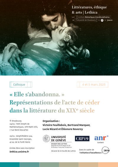 Colloque organisé par Victoire Feuillebois, Bertrand Marquer (Université de Strasbourg), Lucie Nizard (Université de Genève) et Éléonore Reverzy (Université Sorbonne Nouvelle) et par l'ITI Lethica avec le soutien du Centre de Recherche sur les Poétiques du XIXe siècle (CRP19), de l'Université de Genève (Département et Décanat de la Faculté des Lettres), et de l'ANR ConSent (Consentement, éthique sexuelle et sensibilités érotiques)