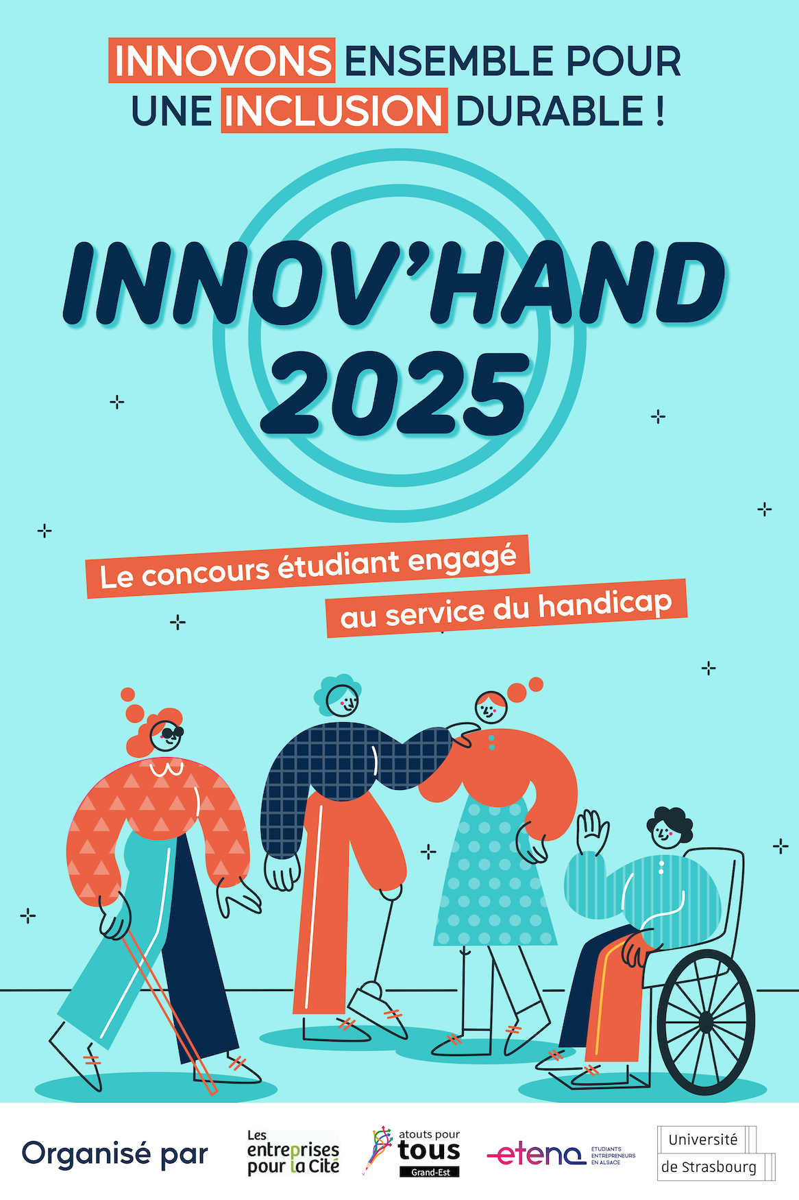 Il s’agit d’un concours étudiant engagé reliant innovation et handicap co-organisé par le Pôle Entrepreneuriat de l'Unistra (Pépite Etena) ! Il vise à faire progresser l’inclusion par le changement de regard, notamment de part et d’autre de la frontière de l’emploi.Des équipes composées de 2 à 6 étudiant·e·s alsaciens concourent, avec l’accompagnement d’entreprises, pour imaginer des solutions innovantes. Innov’Hand porte sur toute solution, produit, innovation technologique, ou ensemble de services destinés aux personnes en situation de handicap.