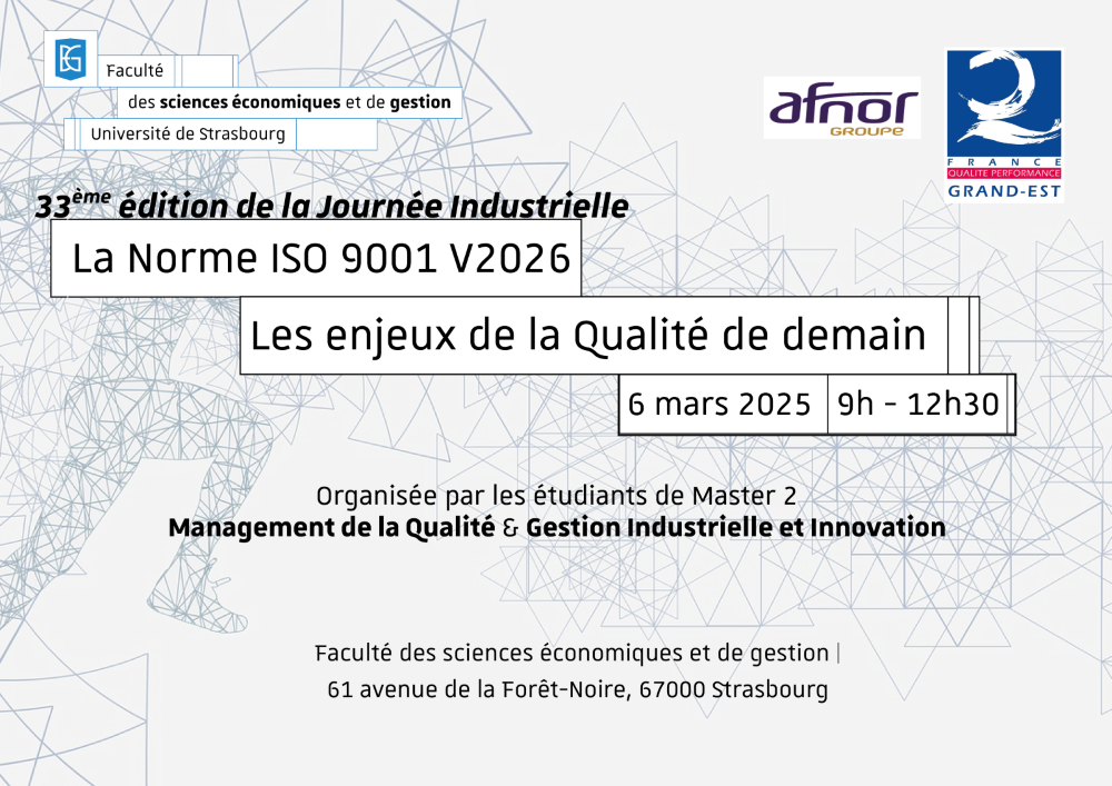 La 33ème édition de la Journée Industrielle intitulée « Préparez votre transition vers la Norme ISO 9001 V2026 » aura lieu jeudi 6 mars à 9h à la Faculté des sciences économiques et de gestion.