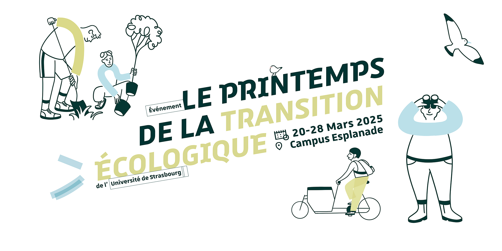Du jeudi 20 au vendredi 28 mars 2025, l’Université de Strasbourg et ses partenaires organisent le Printemps de la transition écologique. Au programme : sensibilisation aux enjeux socio-environnementaux, alimentation, mobilités douces, gestion des déchets, cycles de vie des vêtements, préservation de la biodiversité... des sujets de notre quotidien traités par les associations étudiantes, les services de l’université et les acteurs du territoire.