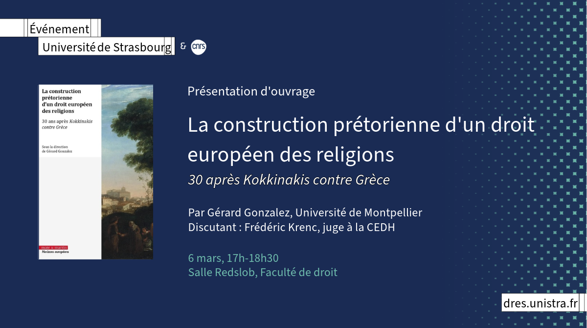 Une présentation de l'ouvrage intitulé « La construction prétorienne d'un droit européen des religions - 30 ans après Kokkinakis contre Grèce », publié chez Mare&Martins, aura lieu jeudi 3 mars à 17h à la Faculté de droit sur la campus de l'Esplanade. Elle sera présenté par Gérard Gonzalez (Université de Montpellier).