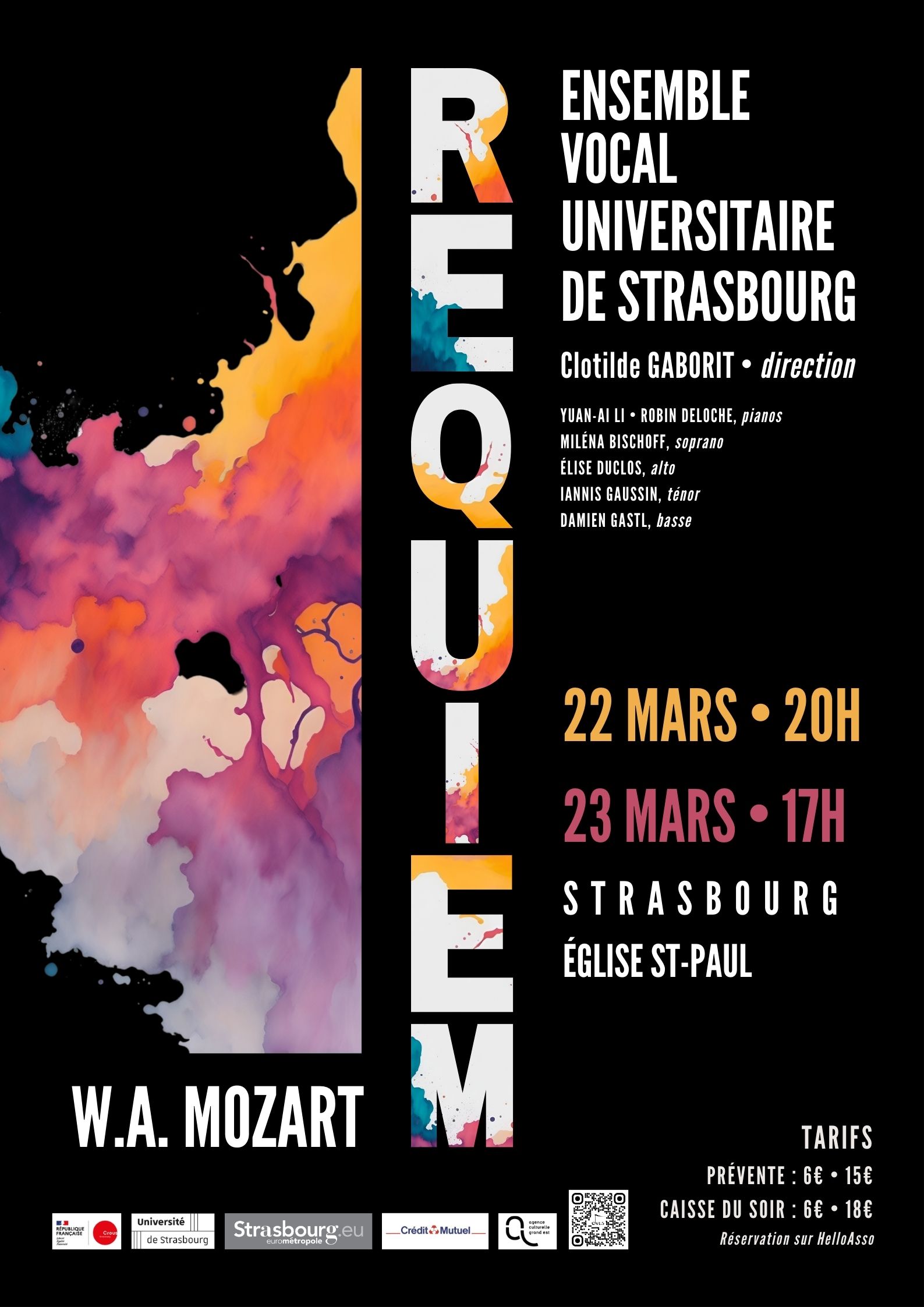 L'Ensemble Vocal Universitaire de Strasbourg (EVUS) a le plaisir de vous inviter à une série de concerts consacrés au Requiem de Mozart, présenté dans un arrangement pour chœur, solistes, deux pianos et timbales. Ce choix d’orchestration met en lumière toute la profondeur et l’intensité de l’œuvre tout en révélant une nouvelle transparence sonore, à la croisée de la puissance orchestrale et de l’intimité du piano.