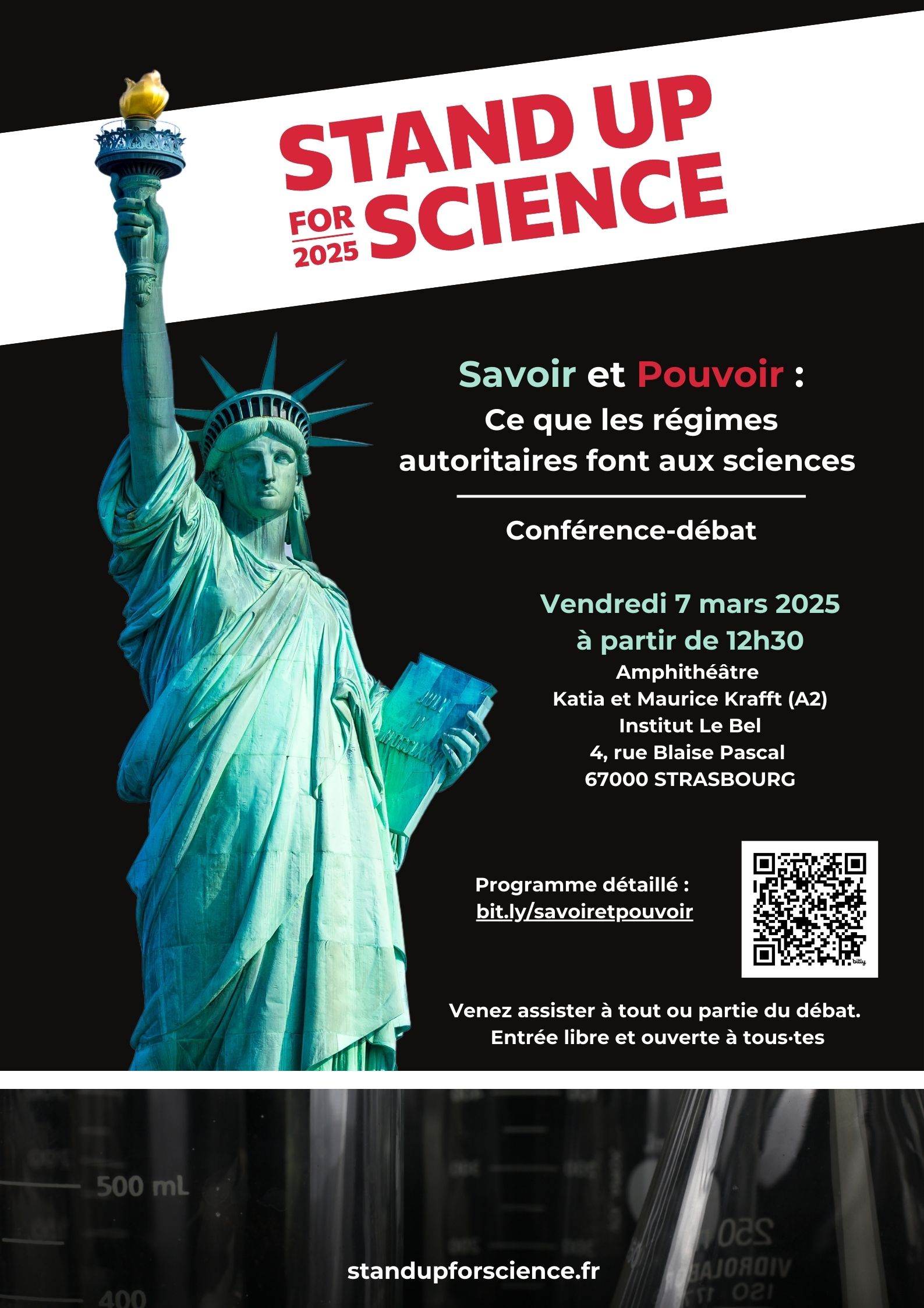 Une conférence-débat en soutien au mouvement « Stand up for Science » lancé aux Etats-Unis intitulée « Savoir et pouvoir : ce que les régimes autoritaires font aux sciences » aura lieu ce vendredi 7 mars 2025, à partir de 12h30 dans l’amphithéâtre Katia et Maurice Krafft (ancien Amphi 2) de l’Institut Le Bel de l’Université (campus Esplanade).