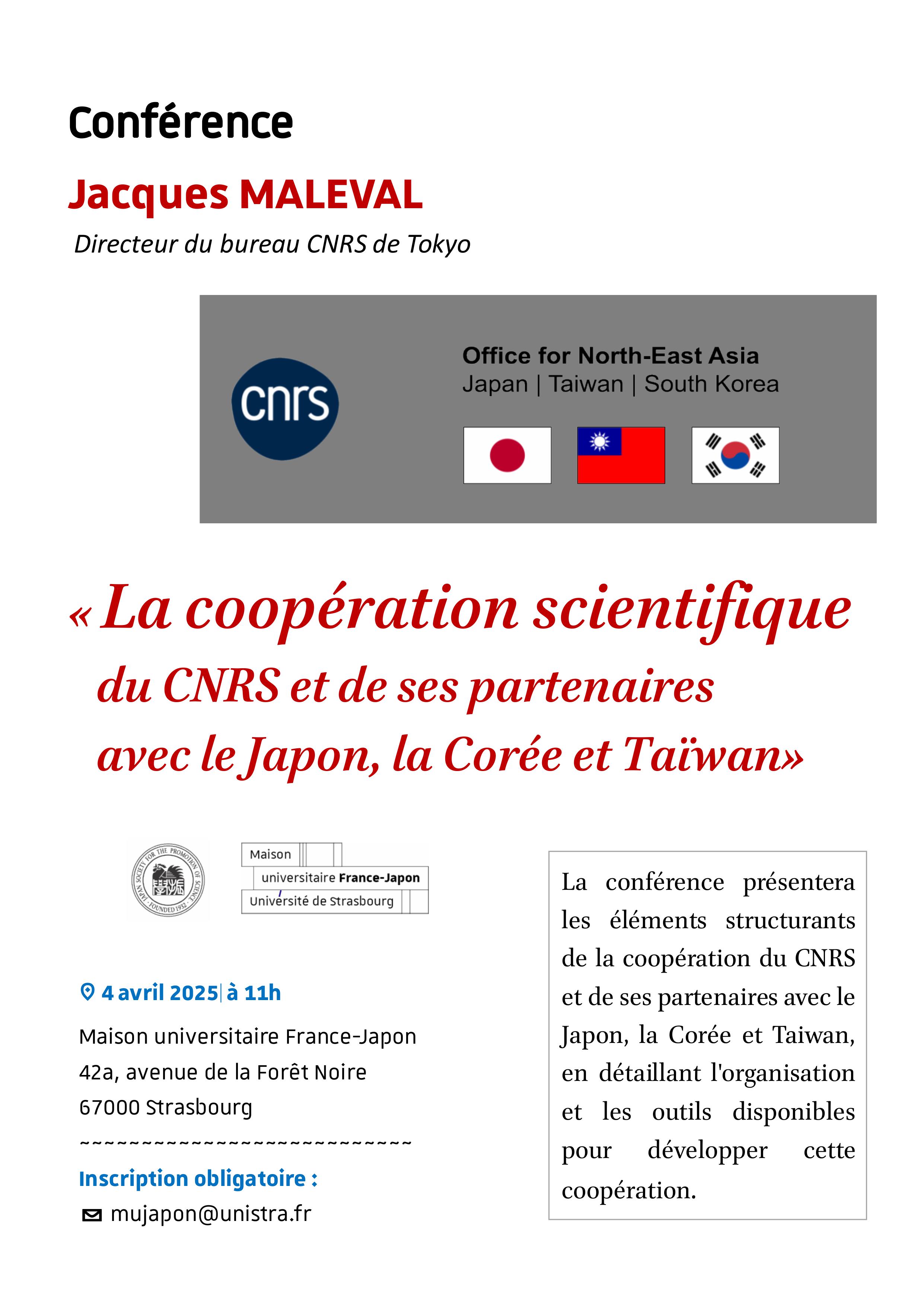 La Maison Universitaire France-Japon, en collaboration avec The Japan Society for the Promotion of Science (JSPS), a le plaisir de vous convier à la conférence de M. Jacques Maleval, Directeur du bureau CNRS de Tokyo, Bureau de Tokyo pour l'Asie du Nord-Est.