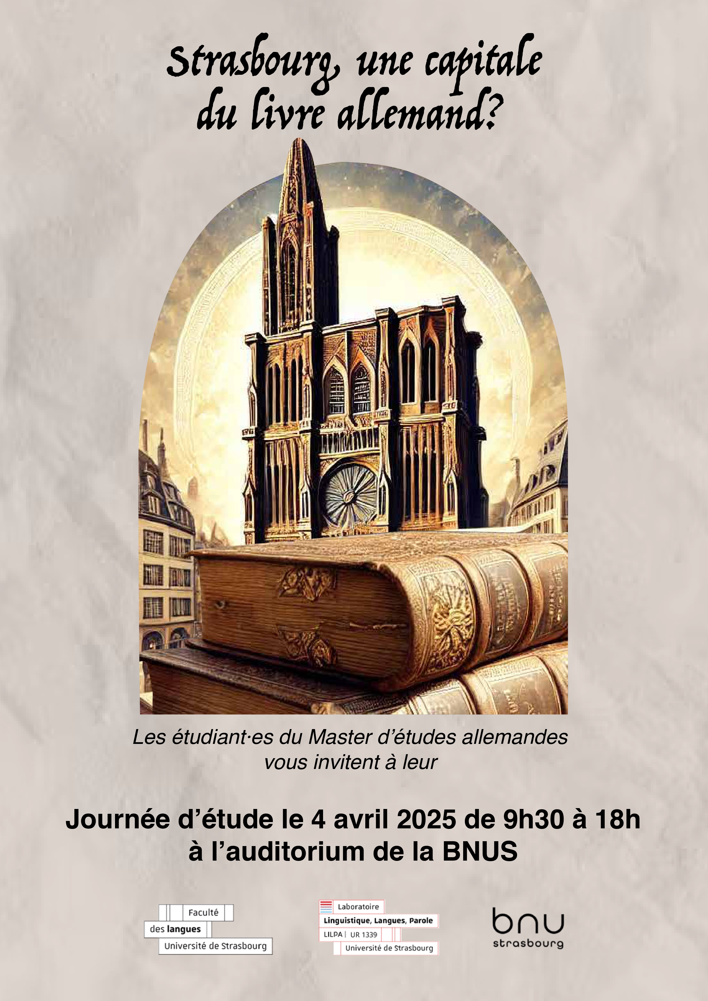 Les étudiants du Master d’études allemandes (Dynamiques sociales et Journée d’étude), organisent une journée d'étude « Strasbourg, une capitale du livre allemand ? ».