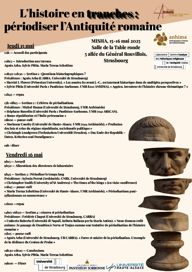 Jeudi 15 et vendredi 16 mai, à la Maison interuniversitaire des sciences de l'homme - Alsace (Misha), se tiendra la seconde rencontre internationale de l’opération scientifique Les temps forts de la République : périodisations, chronologies, générations, qui sera consacrée au thème suivant : « L’histoire en tranches : périodiser l’Antiquité romaine ».