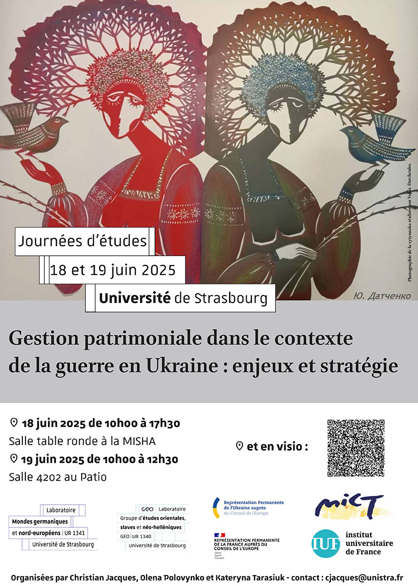Une journée d'études intitulée « Gestion patrimoniale dans le contexte de la guerre en Ukraine : enjeux et stratégies » auront lieu jeudi 19 juin de 10h00 à 17h30 en salle table ronde à la Faculté de langues sur le campus de l'Esplanade.