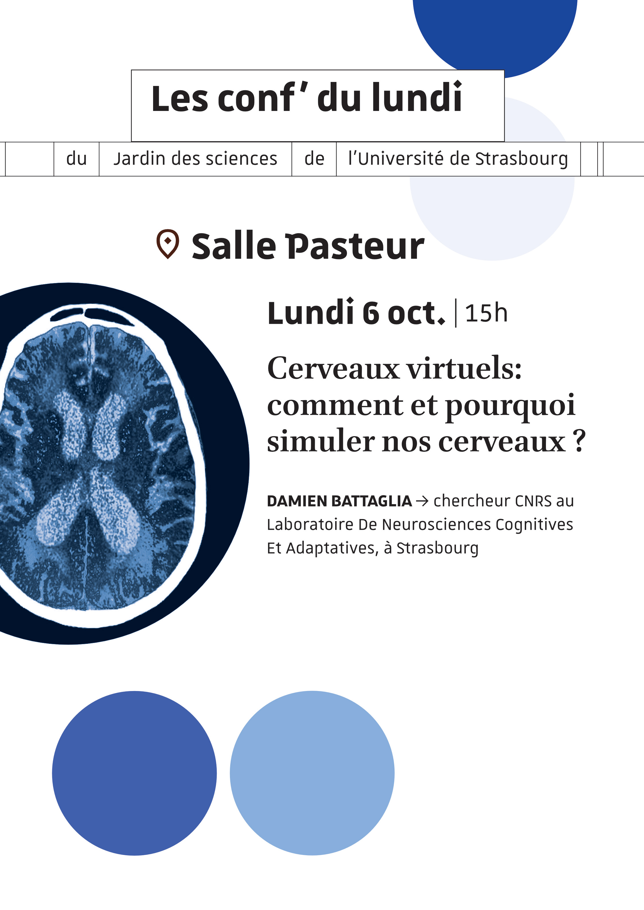 Dans le cadre des Conf' du lundi, une conférence intitulée « Cerveaux virtuels : comment et pourquoi simuler nos cerveaux ? » aura lieu lundi 6 octobre à 15h au Palais universitaire.